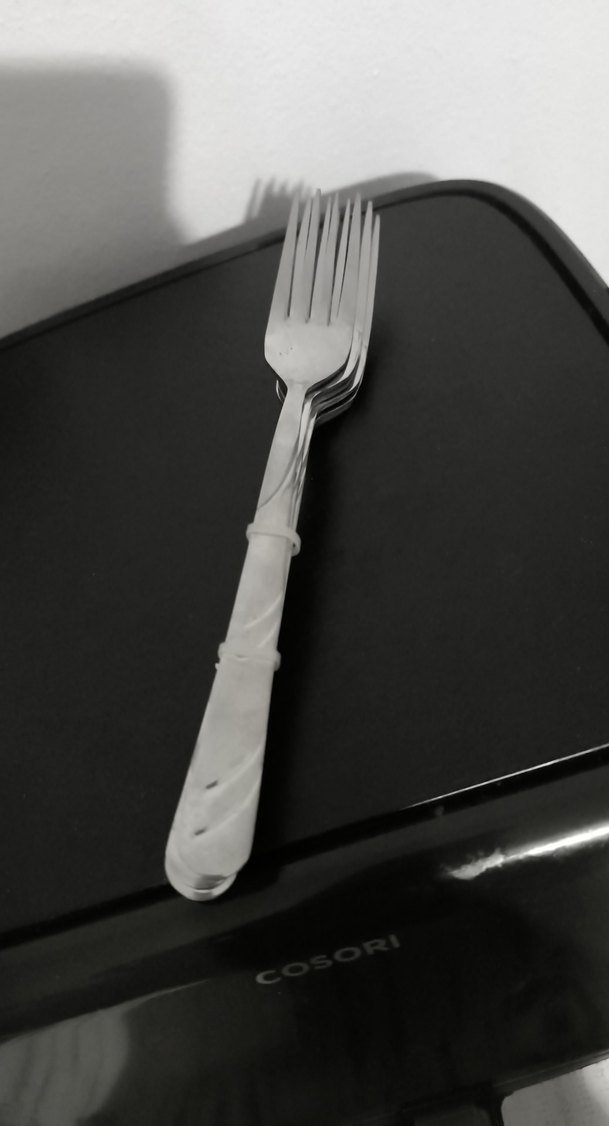 Beyaz saplı, gri renkli, dalgalı detaylara sahip çatal.