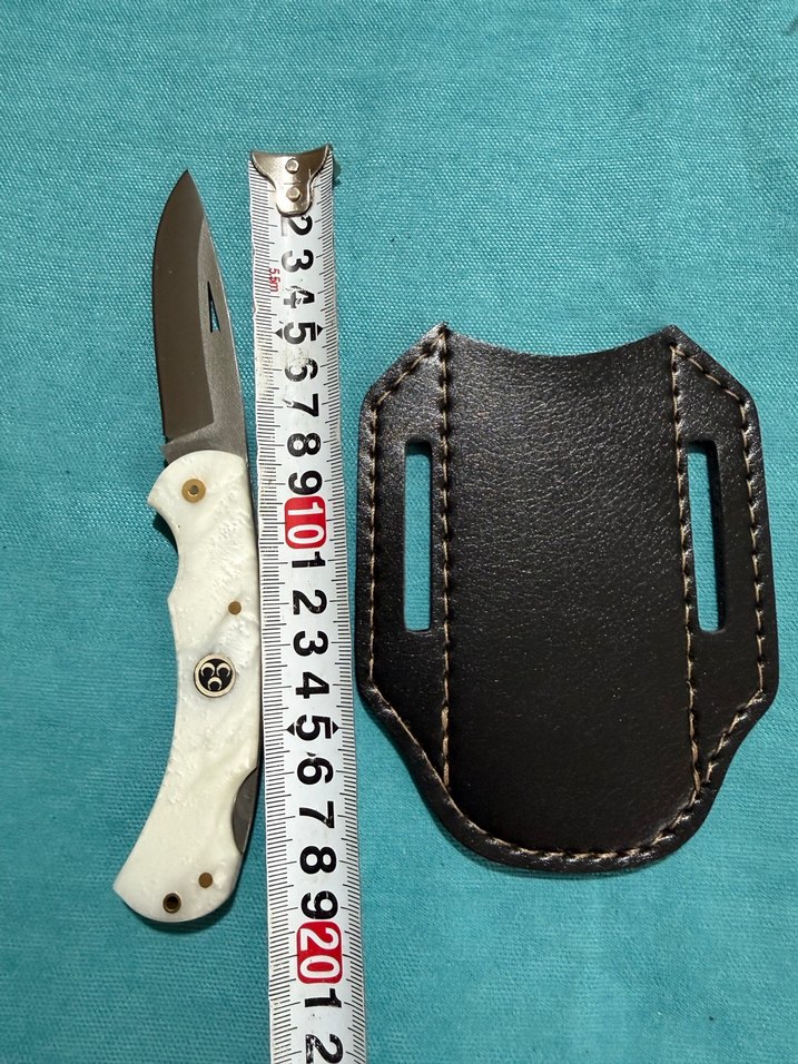Beyaz saplı katlanır çakı ve koyu renk deri kılıfı.Çelik 4116 sırttan kilitli kaliteli çakı