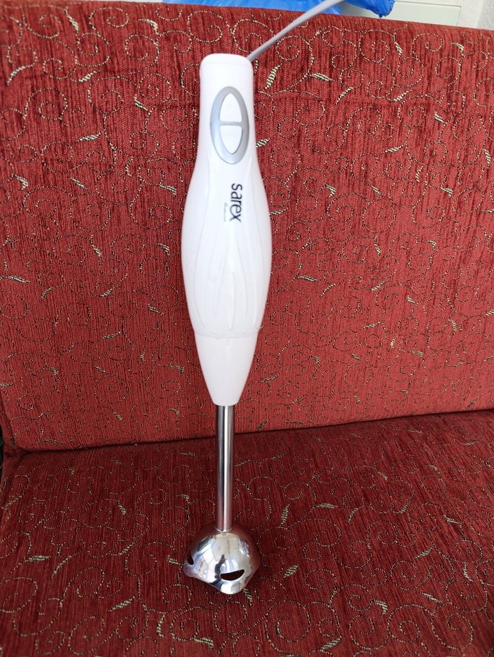 Beyaz renkli Sarex el blenderı, kullanımı kolay düğmelere ve paslanmaz çelik karıştırma ucuna sahiptir. Mutfakta çeşitli işler için uygundur.