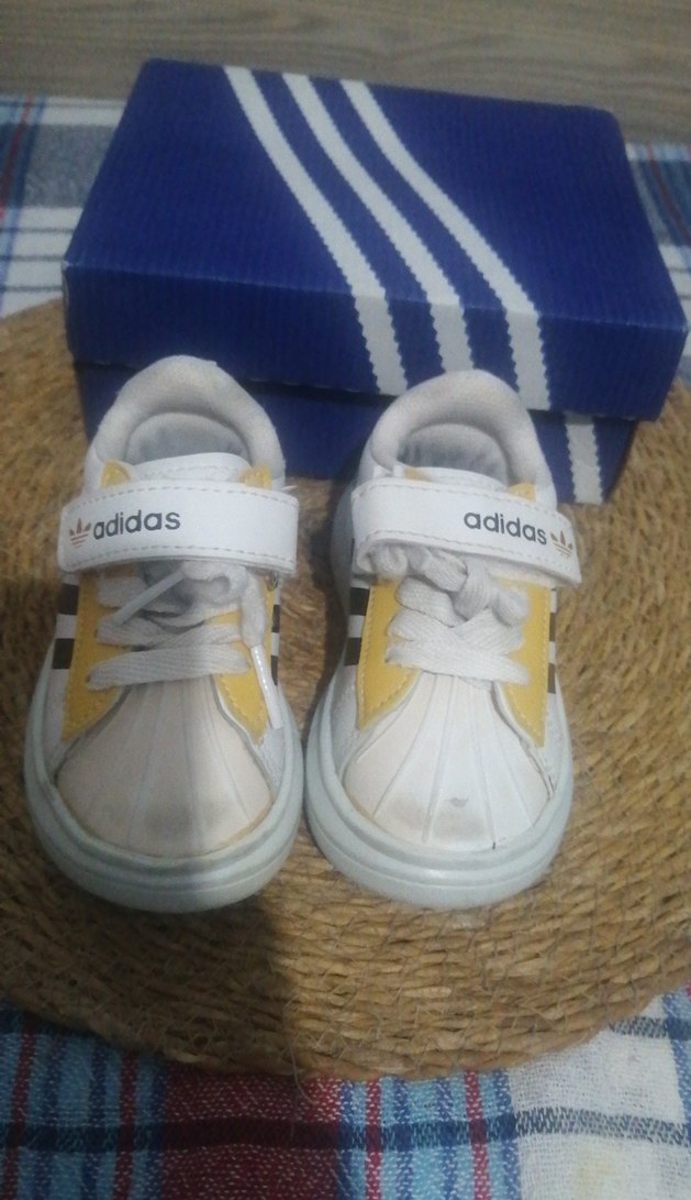 Beyaz Sarı renkli, Velcro bantlı, baskılı desenli ve kauçuk tabanlı erkek çocuk spor ayakkabısı. Rahat ve kolay kullanımlı.mudaildir.