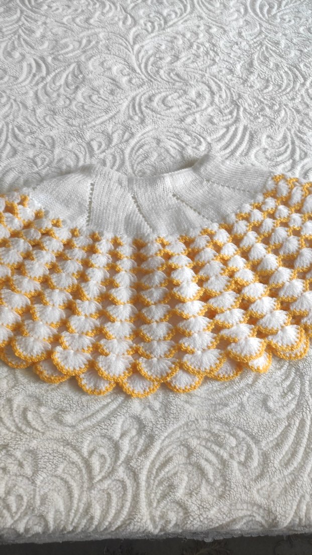 Örgü beyaz kumaştan yapılmış, renkli sarı işlemeli, kayık yaka ve askılı kollu, bol kesim kız pançosu. Bohem ve retro tarzda.
