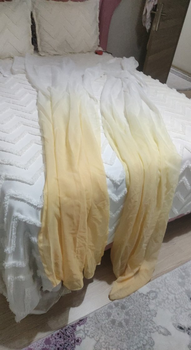 Beyaz ve yumuşak sarı tonlarda elegan geçişli beyazdan açık sarı sonra koyulasan ince tül