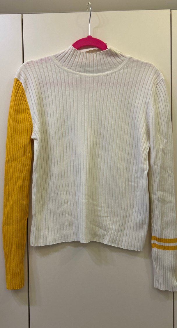 Fitted kesim, beyaz gövde ve sarı koluyla örgü dokulu uzun kollu boğazlı kadın kazak. Rahat ve günlük sokak stili için uygundur.