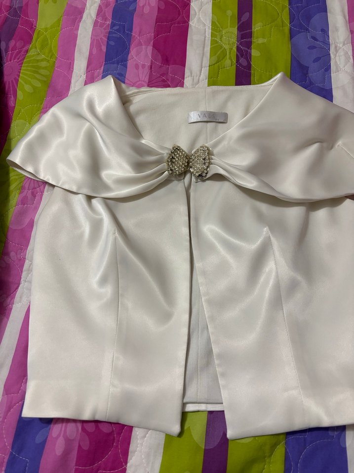 Kız çocukları için straplez yakalı, düğmeli ve şık tokalı beyaz saten bolero. İnce ve parlak dokusuyla zarif bir görünüm sunar. ✨