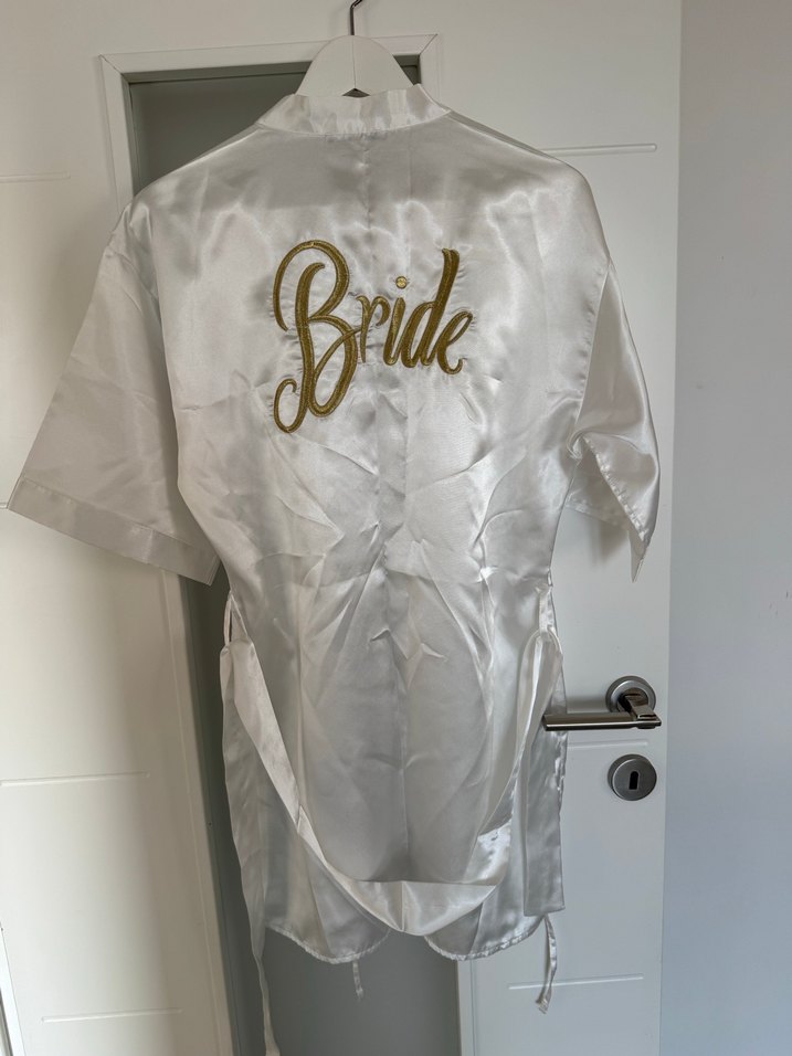 Beyaz saten kumaştan, kısa kollu ve bol kesim olan bu sabahlık, sırtında altın renkli "Bride" baskısına sahiptir. Midi boy ve parlak dokusuyla minimal sokak stiline uygundur.