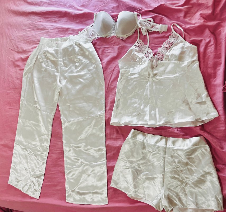 İnce, saten kumaştan yapılmış, dantel detaylı, askılı ve vücuda oturan midi üst ile uzun ve kısa pantolonlardan oluşan bohem tarzda kadın pijama takımı. Xl yazıyor ancak L bedenede olur