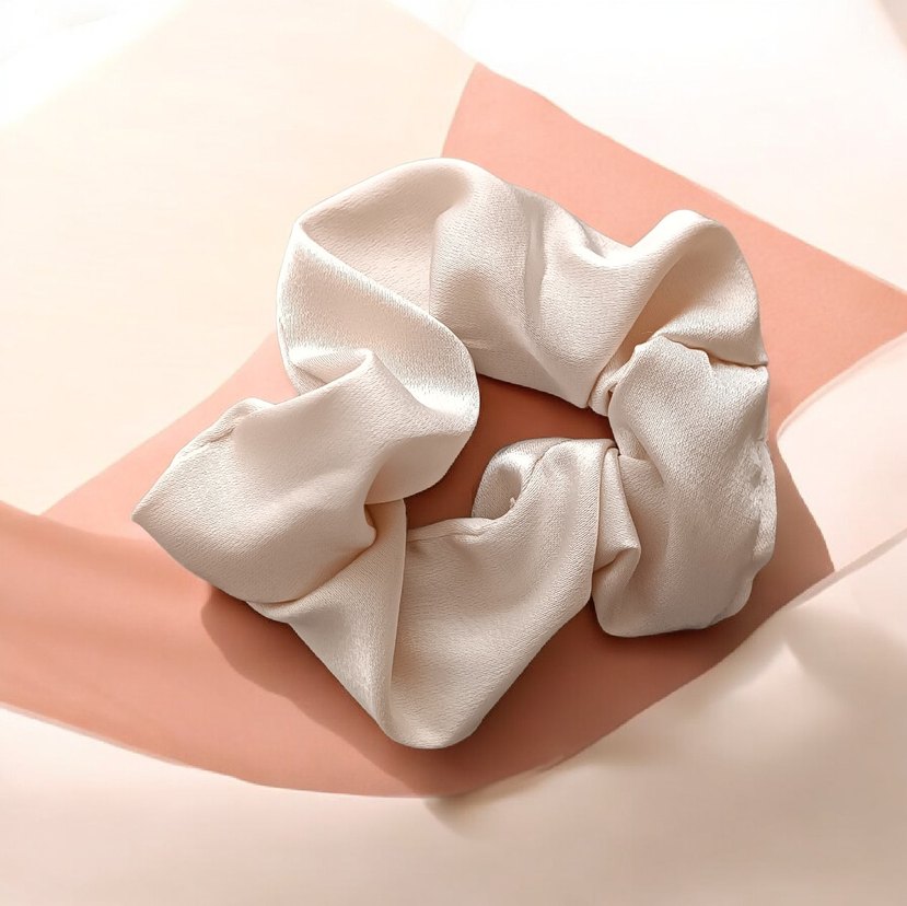 Beyaz saten görünümlü, elastik bantlı saç tokası, sade ve bohem tarzı pastel tonlarla birleştirir.