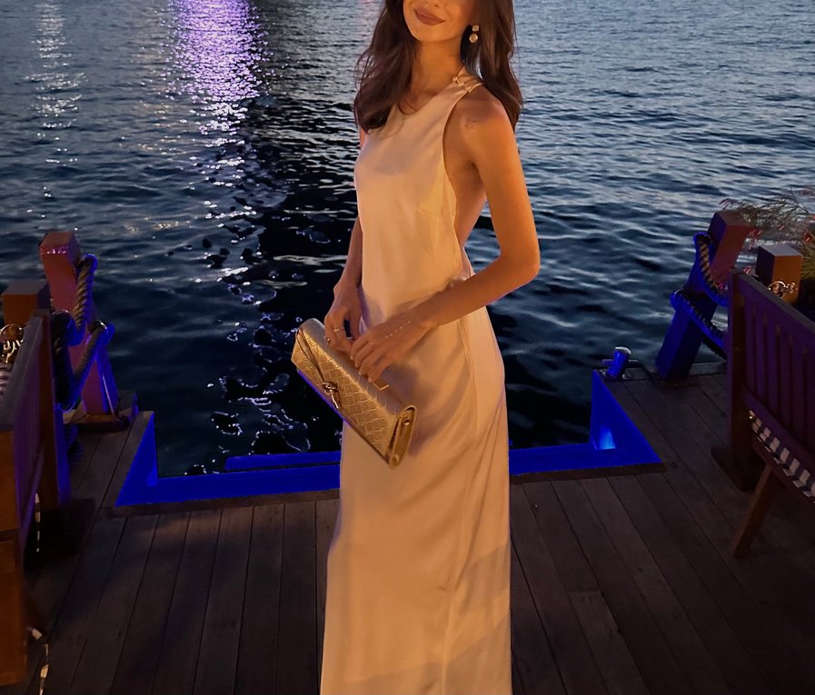 Beyaz renkte, sırt detaylı saten elbise. Bir kez doğum günümde giydim. Romantik ve sofistike akşamlar için ideal.