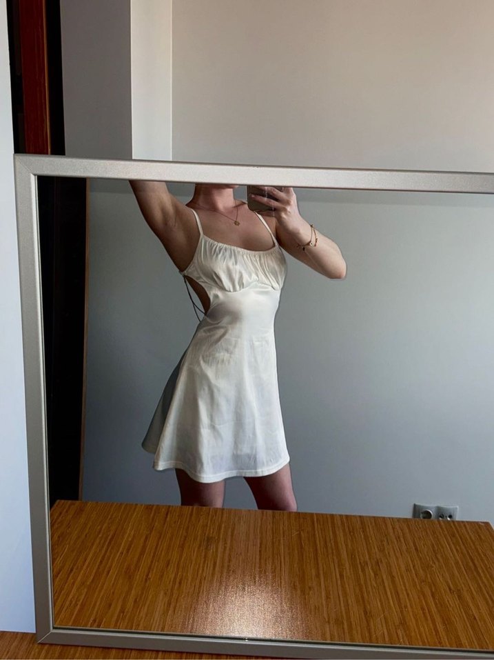 Saten beyaz sırt dekolteli mini elbise. Sırtında taşlı detaylar mevcuttur. Bir kere giyildi ip çekmesi yok. Shein ürünü