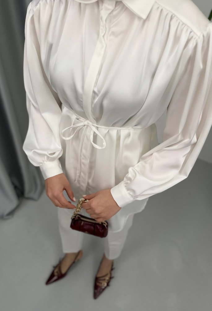 Beyaz renkli kemer detayli saten gömlek