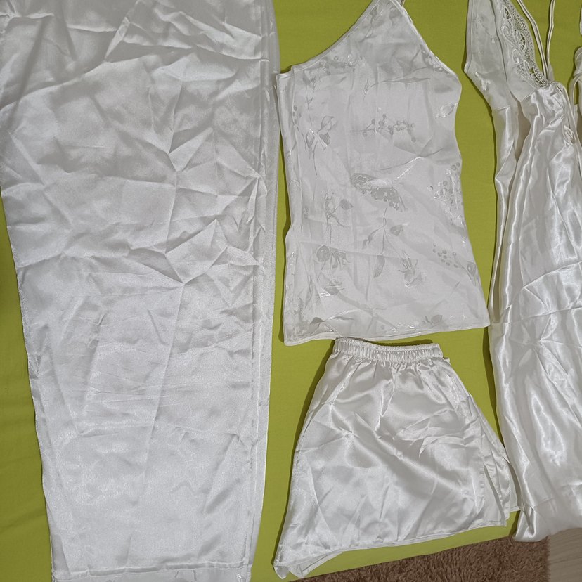 6 parçadan oluşuyor, bir kere dahi giyilmedi, almak isteyen olursa tek tek foto atacağım ürünlerin yükleyemedim hepsini fotoğrafların, sabahlık, alt üst pijama, askılı üst ve alt şort ve uzun askılı gecelikten oluşuyor