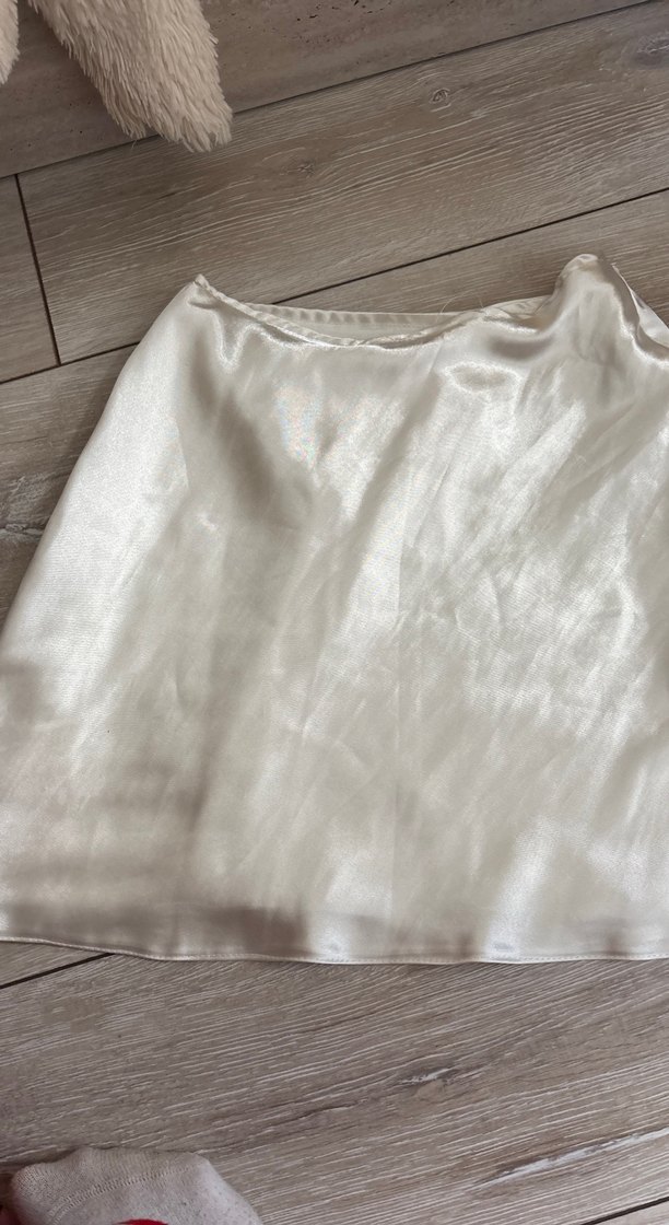 Beyaz, saten görünümlü parlak kumaştan yapılmış, drapeli ve bol kesim midi hamile eteği. Minimalist bohem tarz için uygundur.