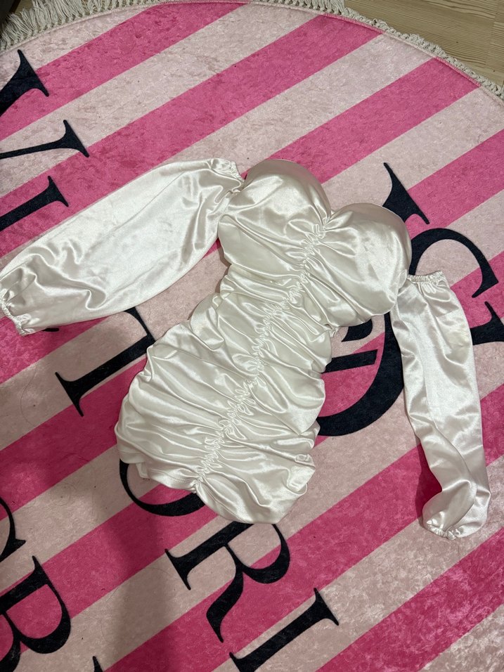 Beyaz,uzun balon kollu ve büzgülü detaylara sahip. Parti için şık ve göz alıcı bir tasarım