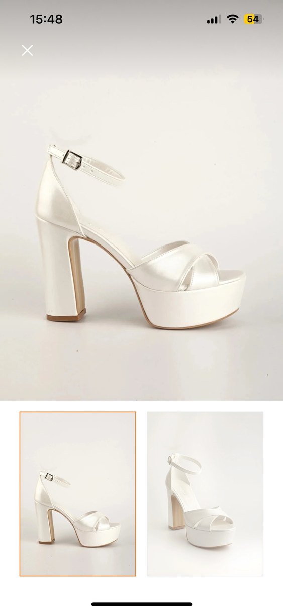 Parlak beyaz rengi ve tokalı bilek kayışı ile platform topuklu abiye ayakkabılar. Saten kumaştan, minimalist ve çağdaş stil sunar, düğünler için uygundur. Gelin ayakkabısı ve gelin mendili
