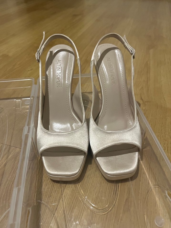 Beyaz saten platform topuklu, tokalı ve parlak görünümlü kadın abiye ayakkabı, modern klasik tarzda, düğün için uygun.
