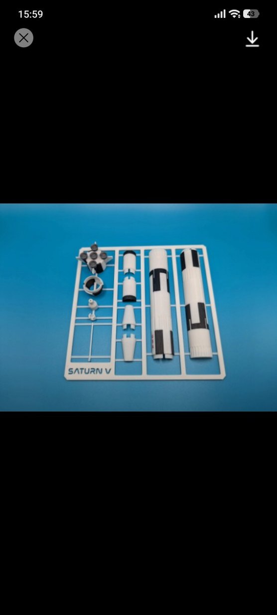 Beyaz Saturn V roket modeli,. Siyah ve kırmızı detaylara sahip.