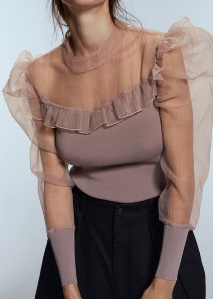 Üst kısmı ve kolları tül triko kazak. İki kol altı 57, boyu 55 cm. Marka temsili