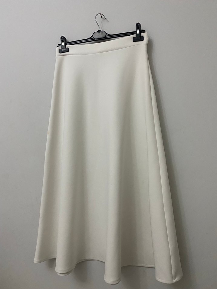 Beyaz uzun etek, salaş kesim ve drapeli tasarıma sahip, ince sentetik kumaştan yapılmıştır. Minimalist, normcore tarzıyla günlük kullanıma uygundur.