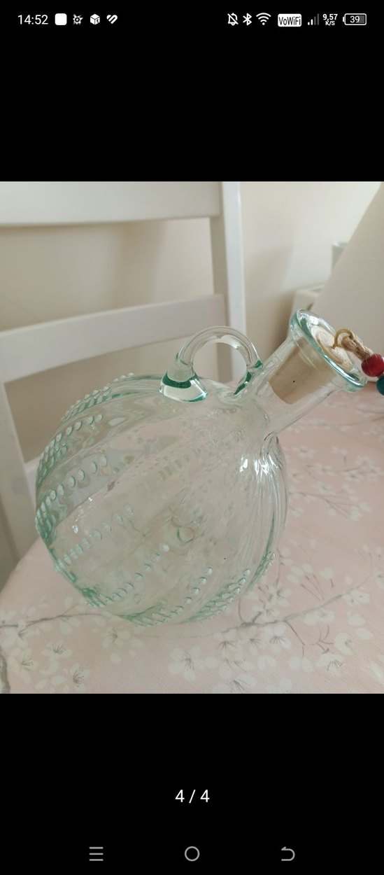 Yuvarlak gövdeli, noktalı dokulu beyaz şeffaf cam vazo. Boyun kısmında küçük kulp ve mantar tıpa üzerinde dekoratif ip bulunur.