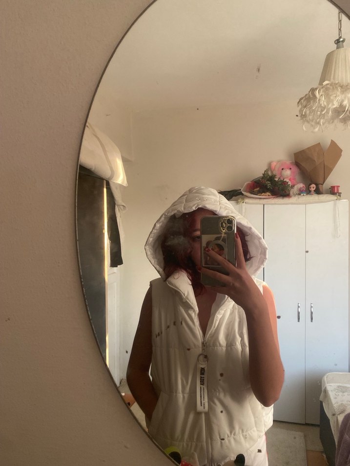Beyaz pamuk kumaştan, yüksek yakalı ve kolsuz, şeffaf detaylı bol kesim kadın yağmurluk. Günlük sokak modasına uygun, avant-garde tarzda. ️
