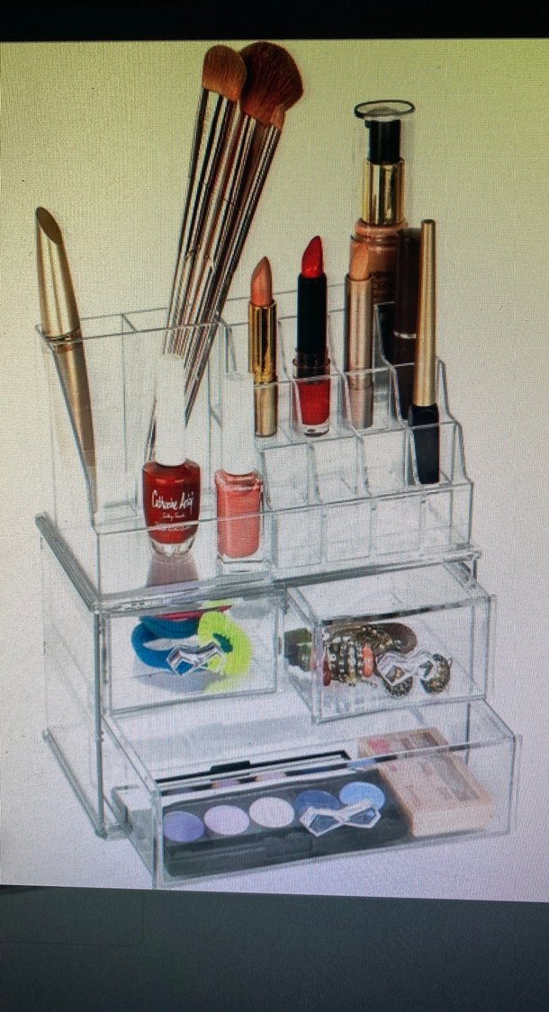 Bu beyaz şeffaf makyaj organizeri, ruj, fırça, oje ve diğer kozmetik ürünleri için bölmeler ve çekmeceler içerir.