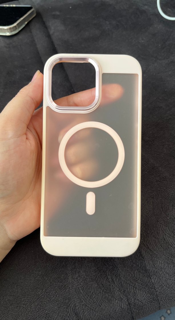 Bu çağdaş telefon kılıfı beyaz renkte, şeffaf bölümler ve dairesel desen içerir. Kamera için kesik alanı bulunur. 16 pro max uyumlu