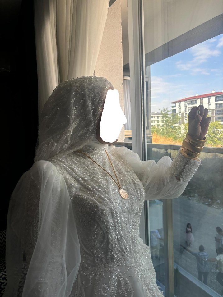 Beyaz Şeffaf Uzun Kollu Tesettür düğün Elbisesi