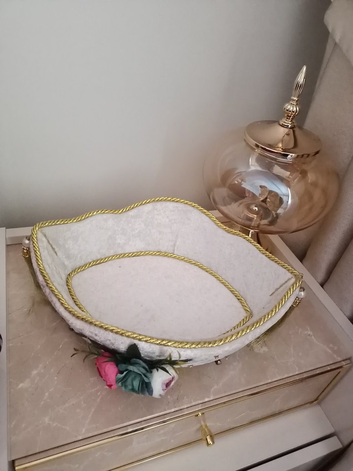 Altın ip detaylı beyaz sepet ve saklama çantası, küçük eşyalar için uygundur.