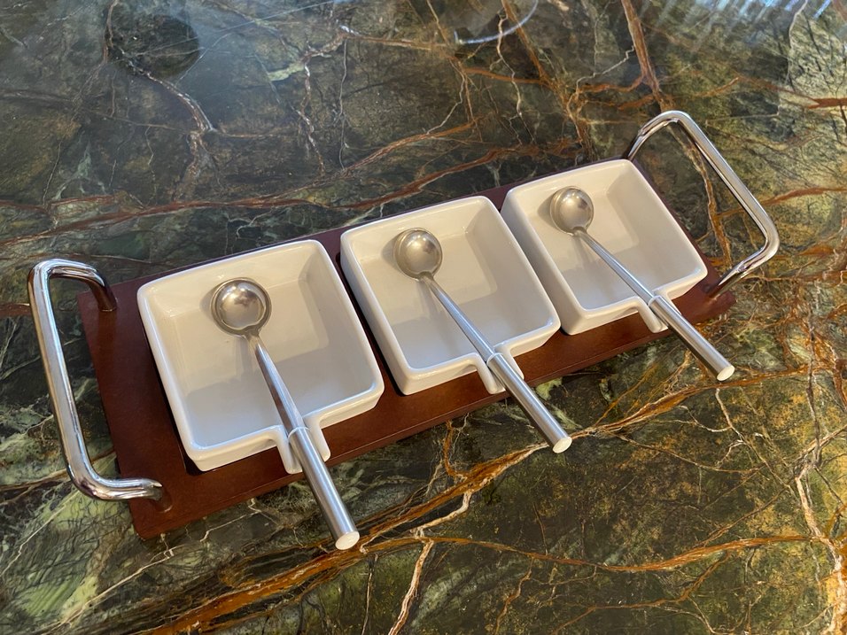 Ahşap taban üzerinde yer alan her birinde metal kaşık bulunan beyaz seramik 3’lü reçel takımı