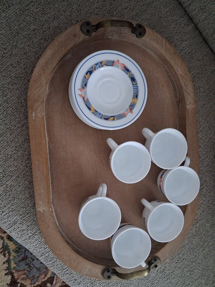 Ahşap tepsi üzerinde desenli bir tabak ile birlikte altı beyaz seramik fincan seti. Çay veya kahve servisi için uygundur. ☕Harmony marka #paşabahçe #çayficanı