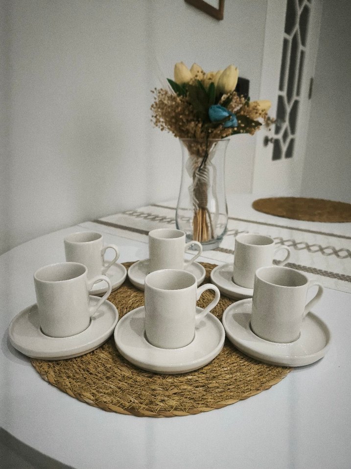 Altı parçadan oluşan beyaz seramik fincan ve tabak seti, sıcak içecekler için uygundur. Her fincan kulpludur ve uyumlu tabak ile birlikte gelir. ☕12 parça fincan yüksekliği 7 cm ve tabak genişliği 12 cm'dir. Fincan hacmi 100 ml'dir.