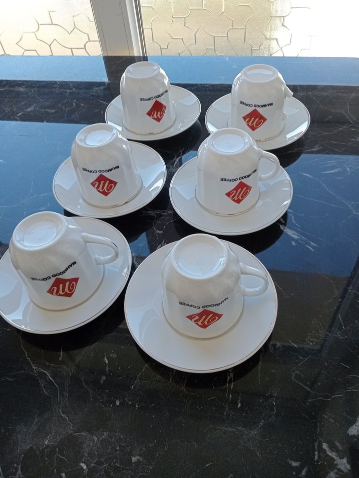 Altı adet beyaz seramik espresso fincanı ve tabak seti, üzerinde kırmızı logo bulunur. Kahve servisi için uygundur. ☕