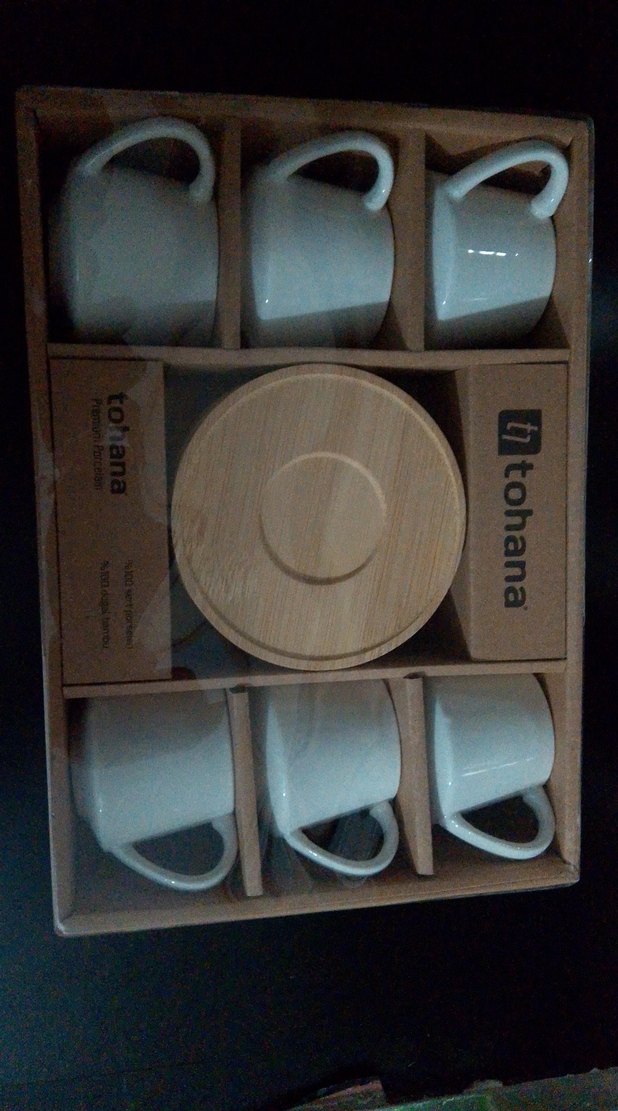Altı adet kulplu beyaz seramik kahve fincanı ve ahşap altlıklar içeren tohana marka set. ☕
