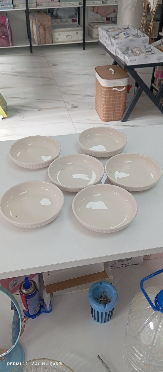Altı adet beyaz seramik kase seti, çeşitli yiyecekler için uygun. Düz ve sade tasarımıyla her sofra için ideal. ️