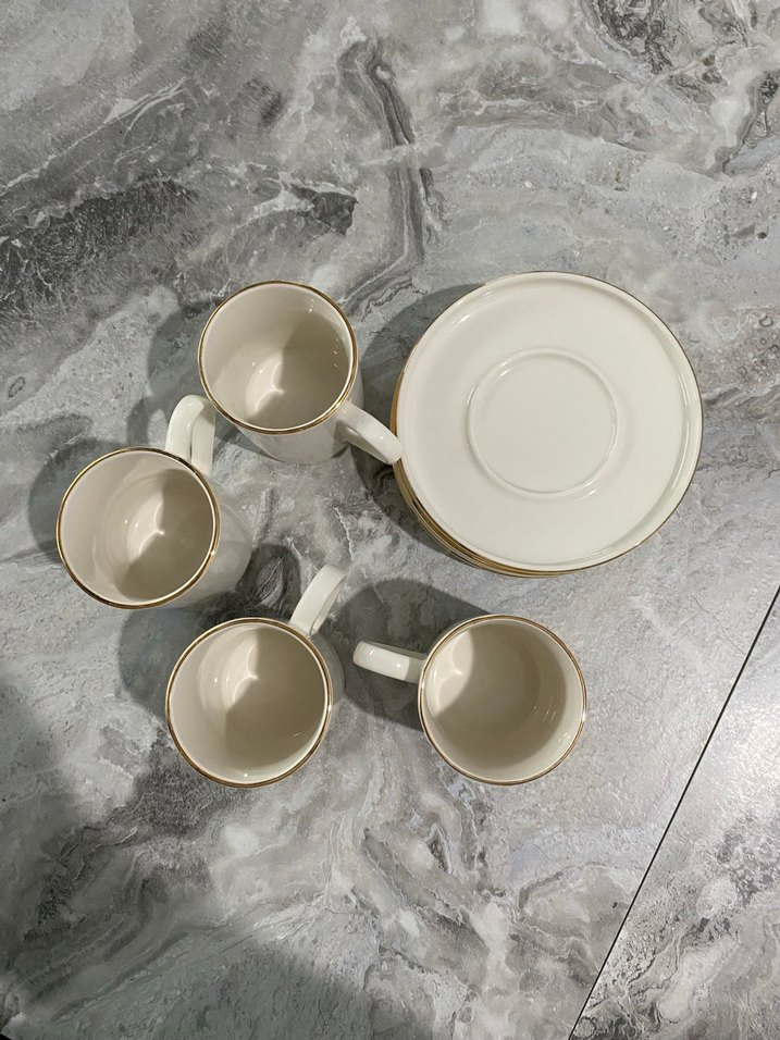 Altın kenarlı beyaz seramikten yapılmış, dört fincan ve dört tabaktan oluşan set. ☕