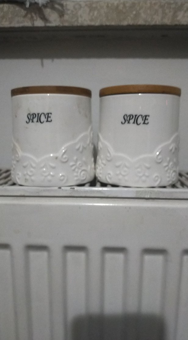 Ahşap kapaklı, çiçek desenli beyaz seramik baharat kavanozları,