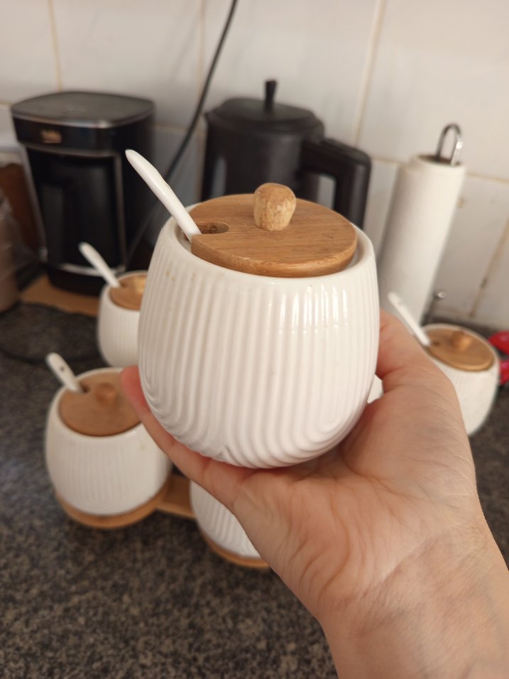 Ahşap kapaklı ve kaşıklı 7 adet beyaz seramik baharatlık, ahşap standlı, ihtiyaç fazlası olduğu için satıyorum