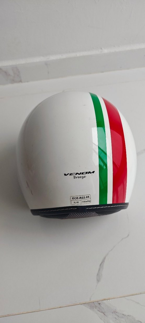Renkli baskılı şeritlere sahip beyaz seramik biker kaskı, Velcro bantlıdır. ECE-R22.05 sertifikalı, sade ve minimalist tasarım sunar. ️Ben kendim kullandım kısa bir süre ama artık açık kask kullanmıyorum