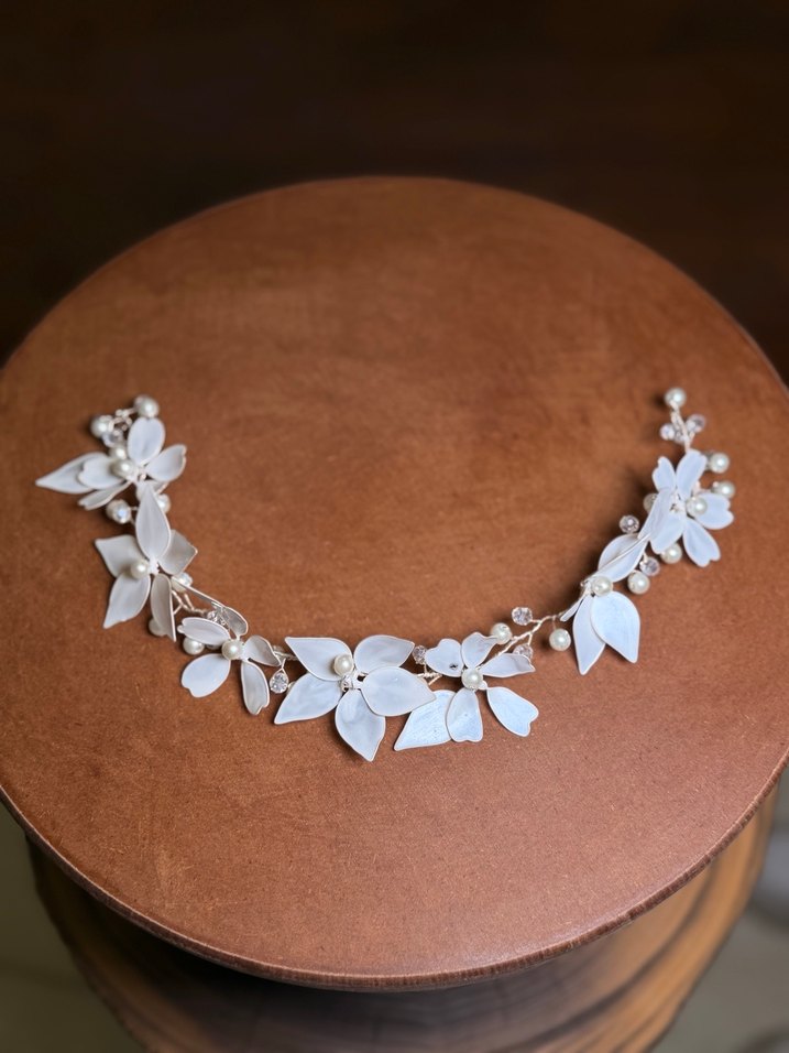 Beyaz seramikten yapılmış, boncuk detaylı, minimalist bohem tarzda saç aksesuarı. Retro ve hippie stiller için uygun.