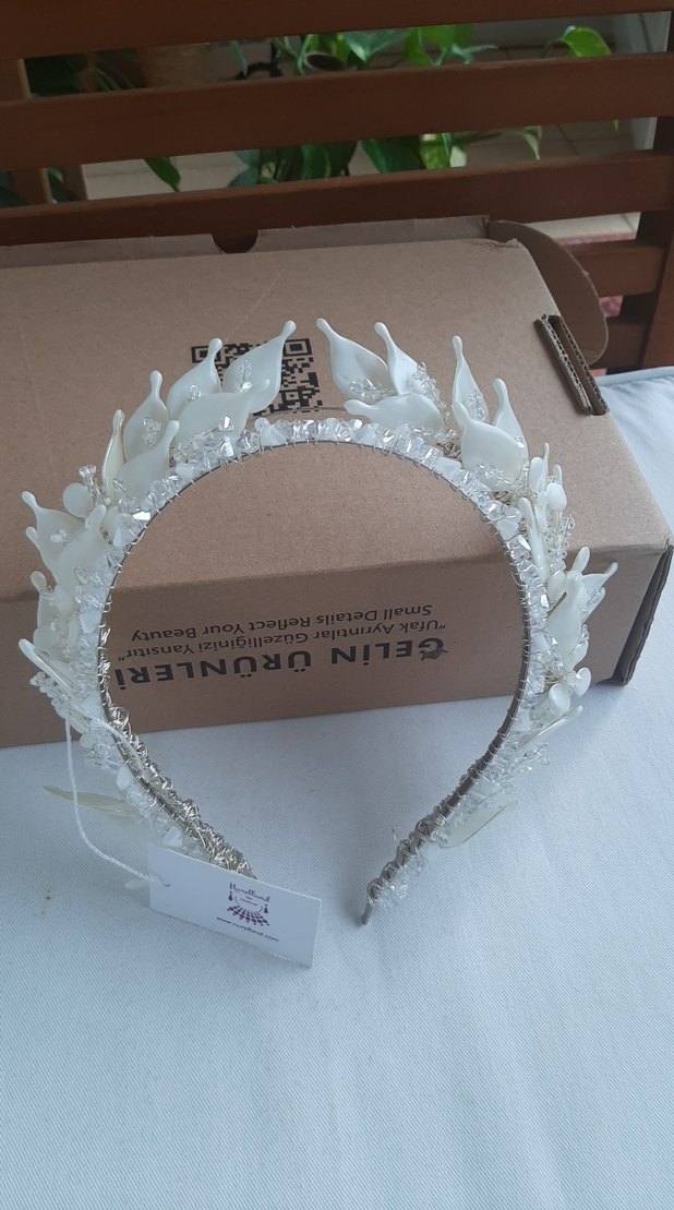 Beyaz seramikten yapılmış, boncuk detaylı bohem tarzda taç. Retro ve hippie görünüme uygun, hafif ve şık aksesuar.