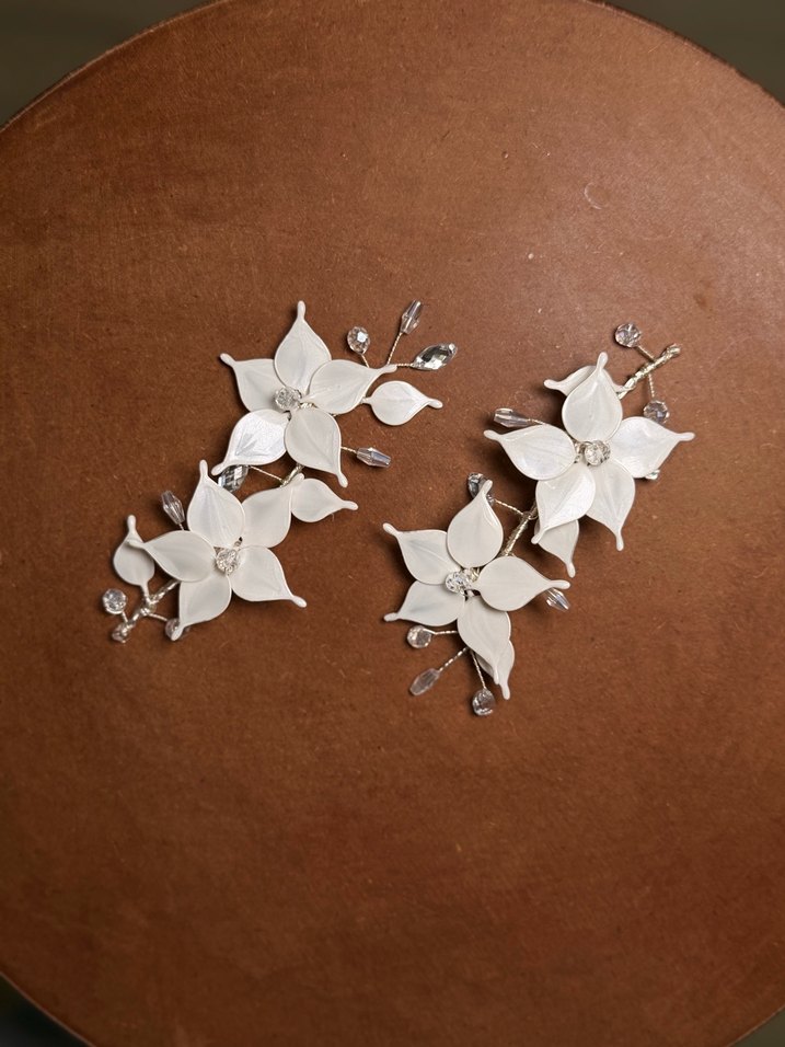Beyaz seramikten yapılmış, boncuk detaylı çiçek şeklinde vintage bohem tarzda saç tokaları. Hafif renkli ve sade görünüme uygun.