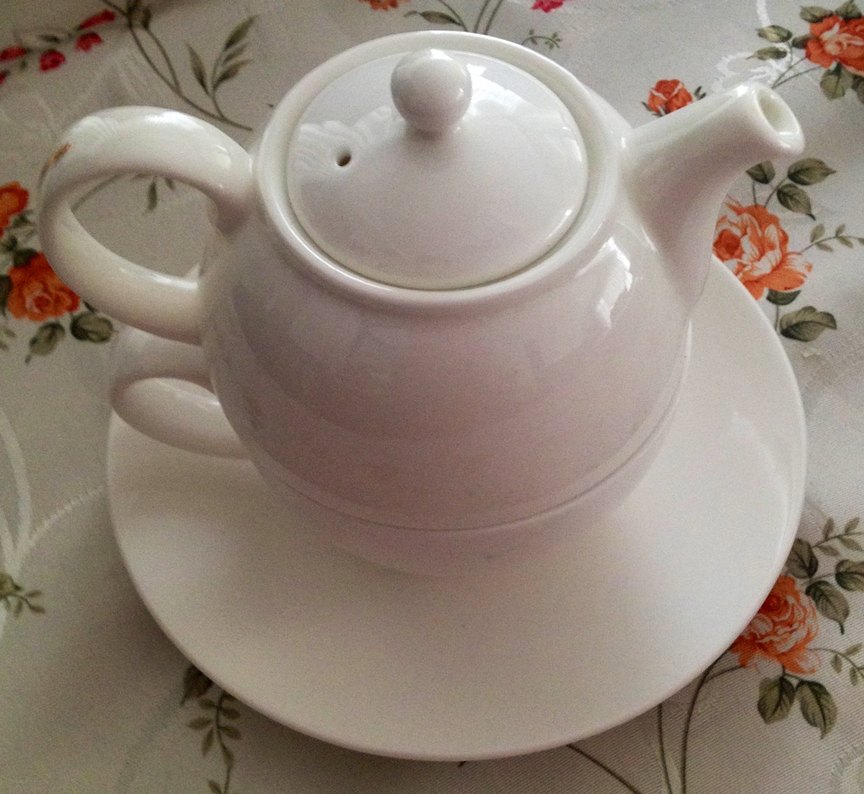 Beyaz seramikten yapılmış, kapaklı ve kulplu çaydanlık. Yanında uyumlu bir tabakla servis için uygundur.