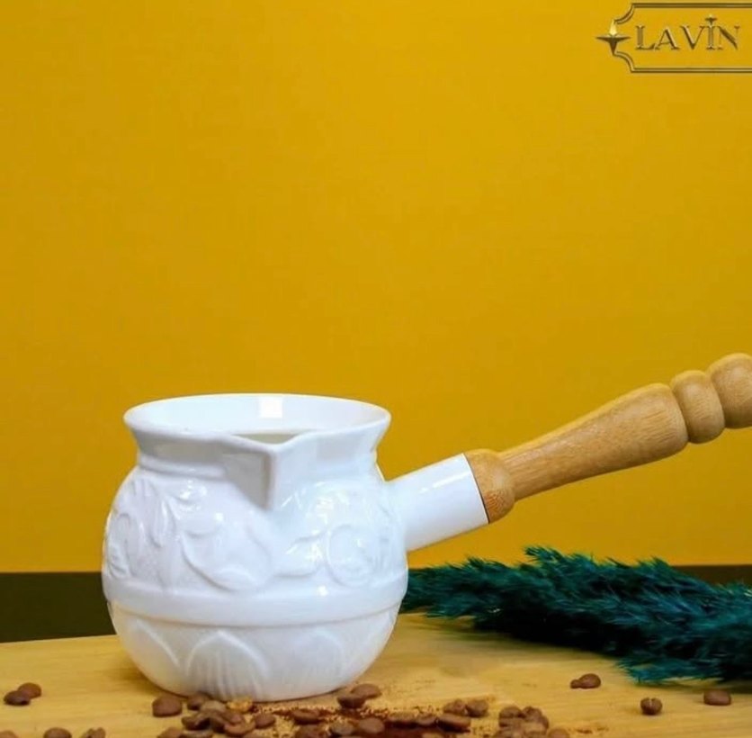 Pastel beyaz renkte, ahşap saplı seramik çaydanlık. Şık ve kullanışlıdır.