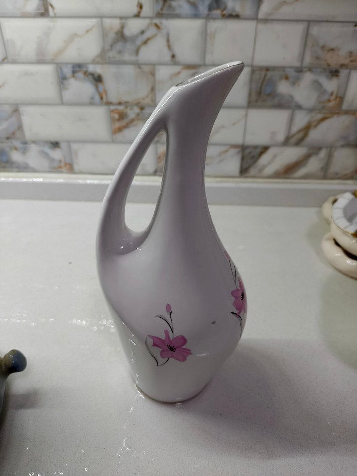 Pastel tonlarda beyaz seramikten yapılmış, çiçek desenli ve şık kulplu vazo. Dekoratif amaçlı kullanıma uygundur.