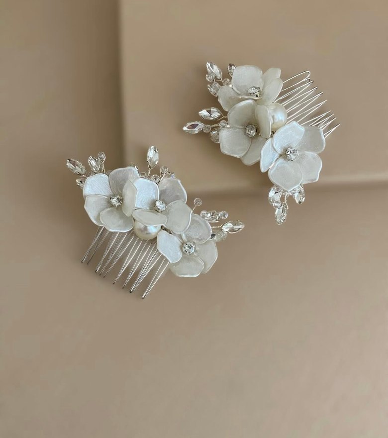 Beyaz seramik boncuklu çiçek detaylı saç tokaları, klasik ve bohem tarz için uygundur.