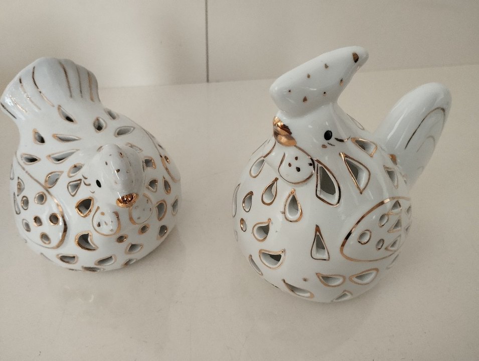 Altın detaylı, oyma desenlere sahip beyaz seramik dekoratif figürinler, şık bir dokunuş sağlar.