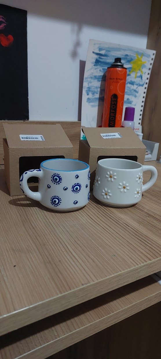 Bu set, dekoratif desenli iki beyaz seramik kupa içerir. Biri mavi dairesel desenlere, diğeri kabartmalı beyaz papatyalar sahiptir. Rahat kulplu ve pürüzsüz yüzeylidir. ☕tek fiyattır