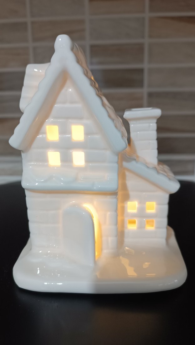 Bu beyaz seramik ev biblosu, küçük ışıklı pencereleriyle sıcak ve samimi bir görüntü sunar. Pürüzsüz yüzeylere ve detaylara sahiptir.