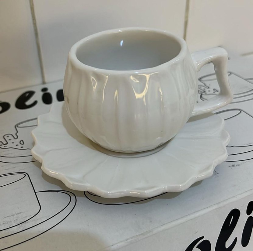 Dokulu yüzeye sahip beyaz seramik fincan ve tabak seti, klasik ve zarif bir görünüm sunar ☕.
