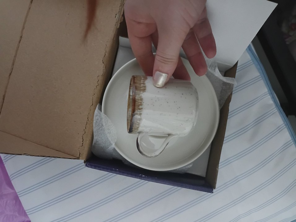 Gri tonlarında benekli, kahverengi kenarlı beyaz seramik fincan ve tabak seti. Sıcak içecekler için uygundur. ☕